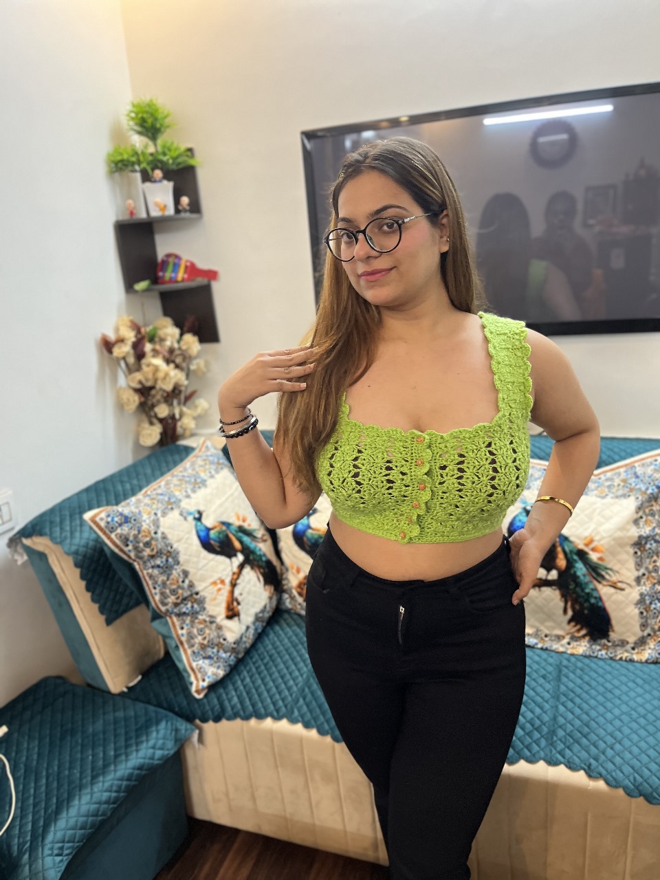 Embrace effortless charm with our Botanic Bliss Top, a handcrafted crochet masterpiece designed for the free-spirited fashion lover. Made with soft, breathable yarn, this vibrant lime-green crop top features intricate lacework, delicate scalloped edges, and a button-down front for a touch of vintage charm.