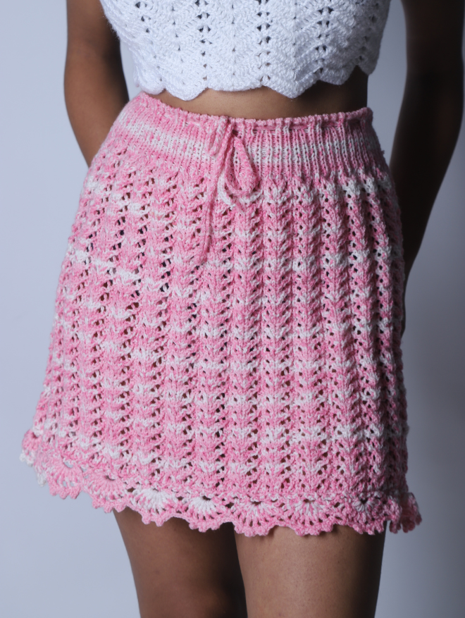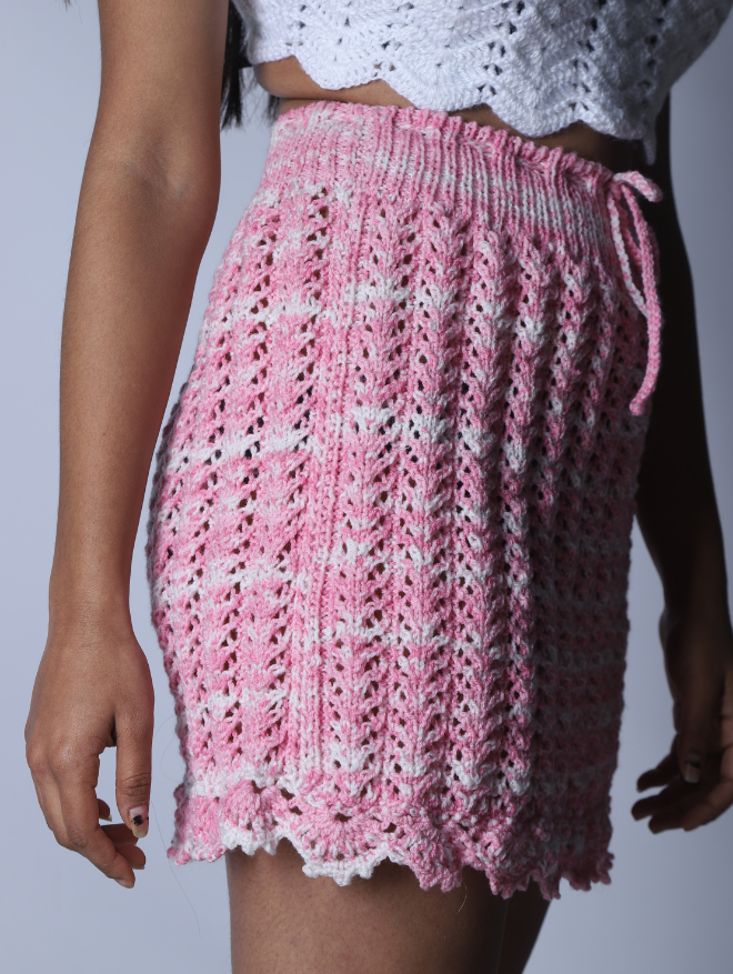 Delicate, dreamy, and effortlessly chic – our Cotton Candy Skirt is a handcrafted masterpiece designed for elegance and comfort. Featuring intricate lacework in a soft pink and white gradient, this skirt exudes femininity and grace. The high-waisted fit, adjustable drawstring, and scalloped hemline add to its charm, making it a perfect piece for both casual outings and special occasions.