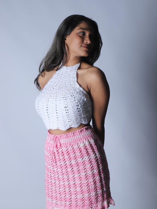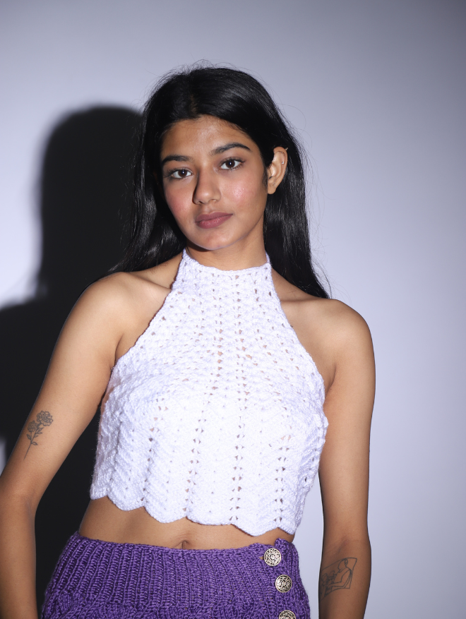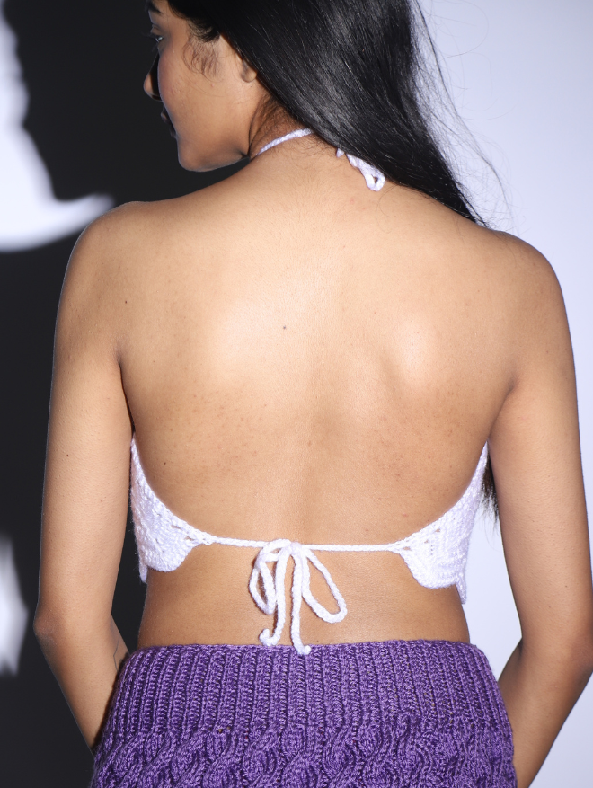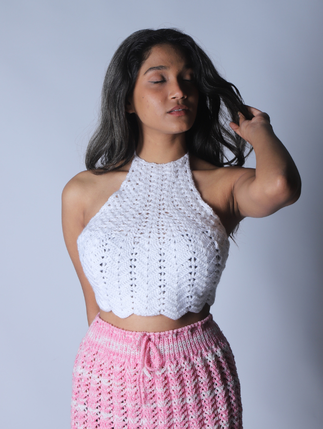 Delicately handcrafted with intricate crochet patterns, the Ivory Bloom Halter is a timeless piece designed for effortless elegance. Made from soft, breathable cotton, this lightweight top offers a dreamy, airy feel—perfect for sunny days and balmy evenings. The high-neck halter silhouette beautifully enhances the neckline, while the scalloped hem adds a touch of feminine charm.