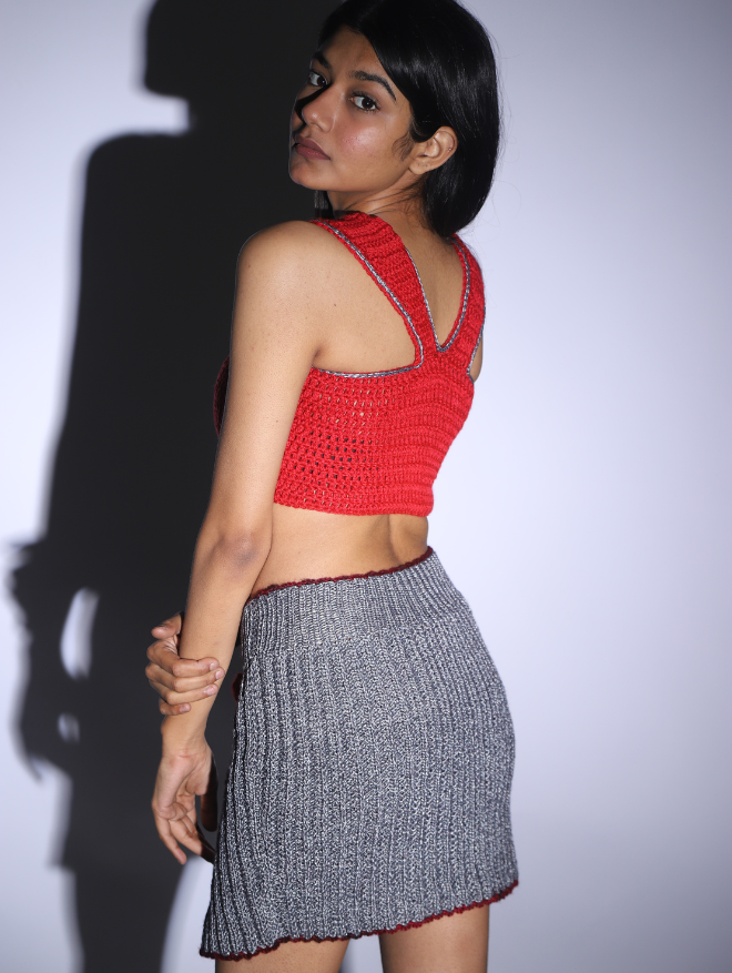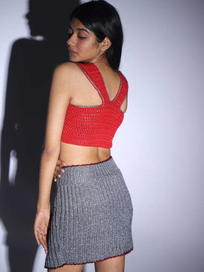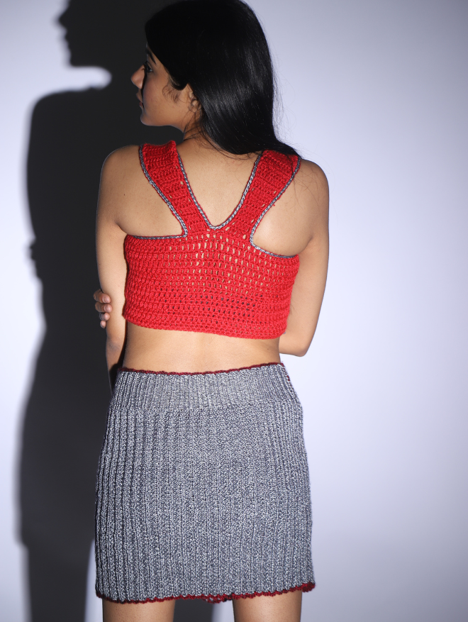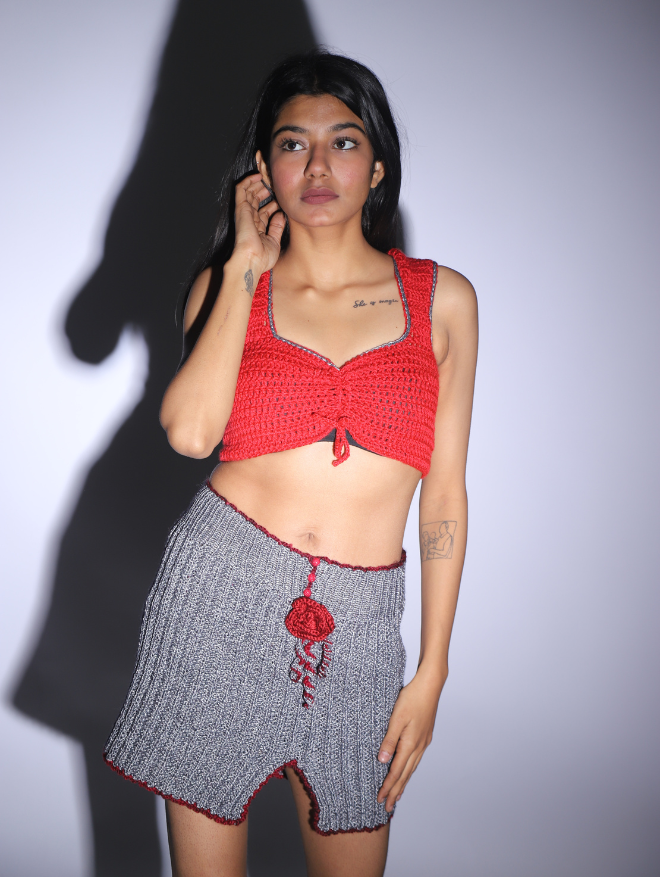 Turn heads with the Scarlet Bloom Co-Ord, a striking handcrafted set that blends boldness with intricate artistry. This unique two-piece features a fiery red crochet top with a flattering ruched front and contrast edging, paired with a ribbed knit skirt in a sophisticated gray hue, accented with delicate red trims and a statement crochet floral detail.