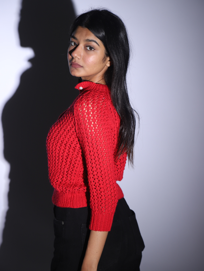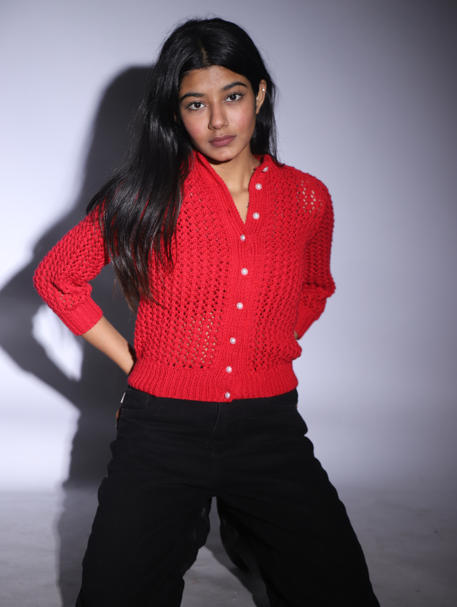 Style Tip: Add this vibrant red cardigan to your wardrobe for a statement look that exudes confidence and femininity.